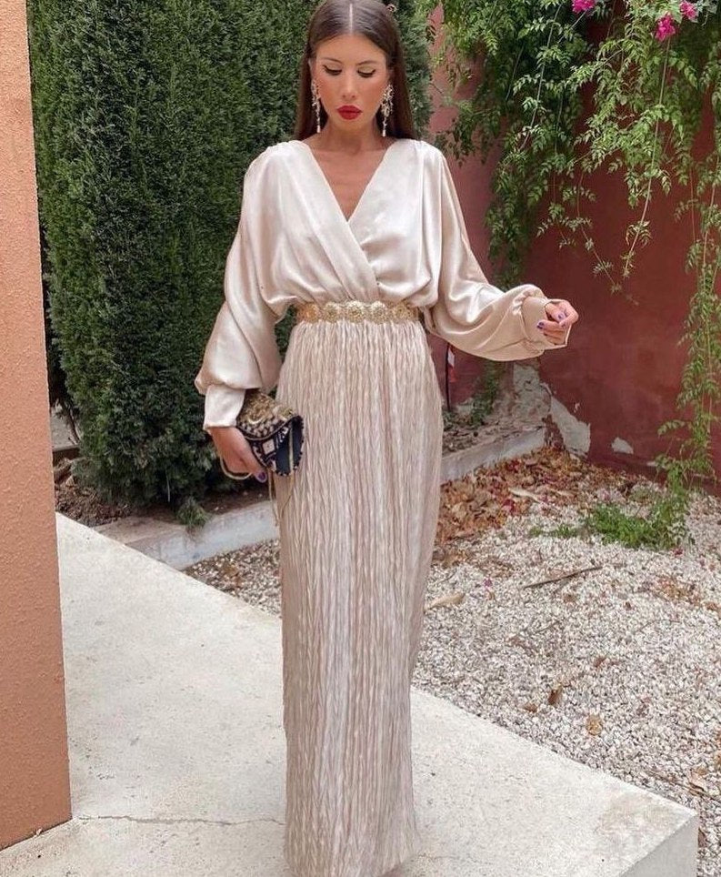 L'abito Eloise, realizzato in morbido raso, si adatta perfettamente alle curve del corpo grazie al suo design avvolgente. Il suo elegante scollo a V e le maniche lunghe lo rendono ideale per le cerimonie. Scegliendo questo abito, potrai essere sicura di avere un look impeccabile e di sentirsi al massimo del comfort.