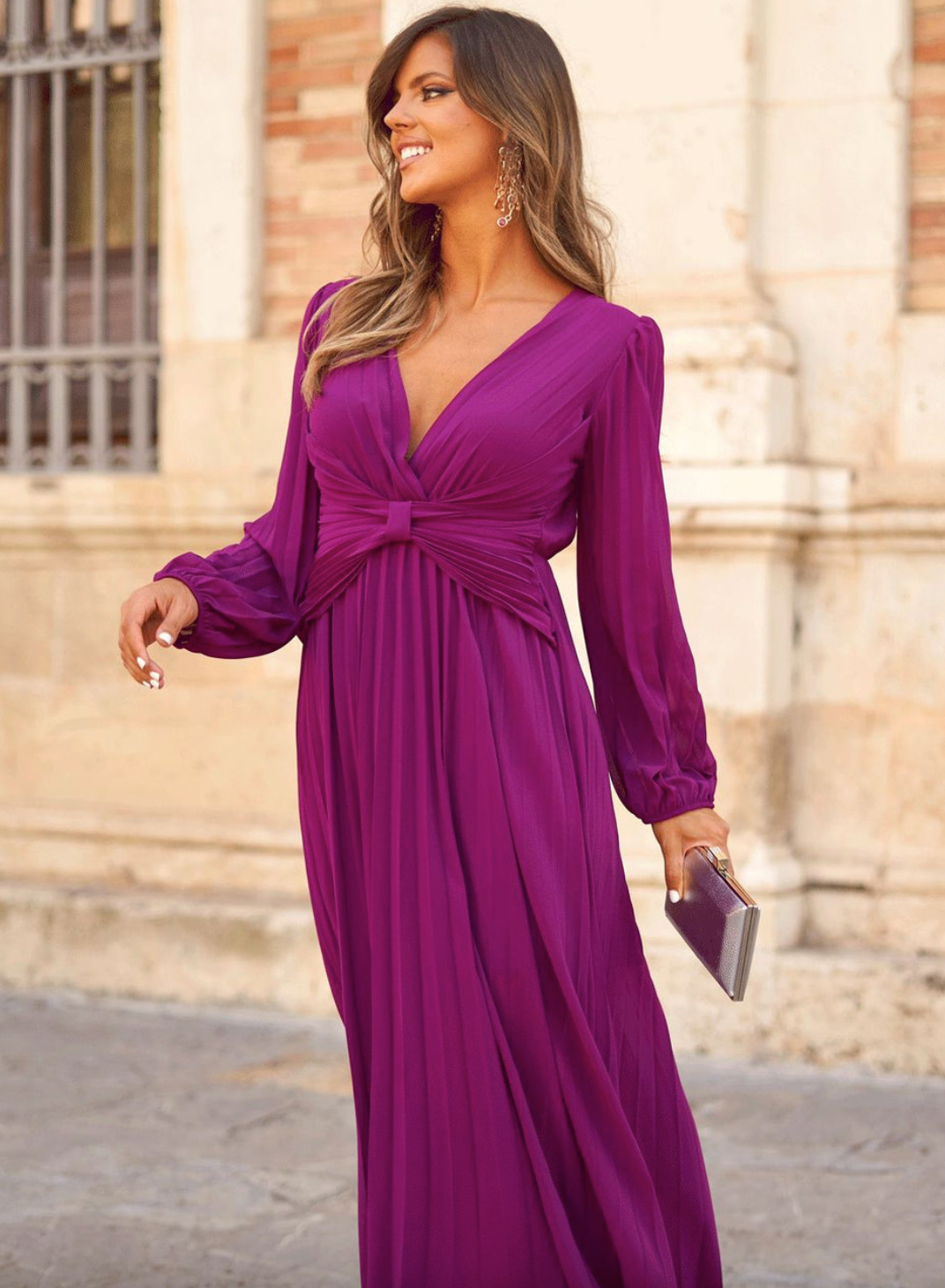 Questo abito Stefi è perfetto per un look elegante in occasione di cerimonie. Con uno scollo a V e maniche lunghe velate, è ideale per essere indossato in diverse occasioni. Non solo elegante, ma anche comodo, grazie alla sua vestibilità perfetta.