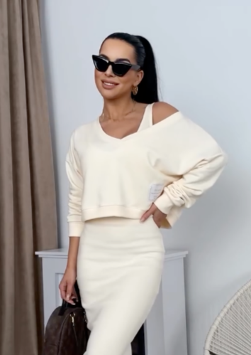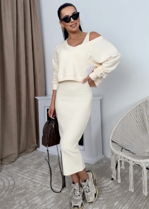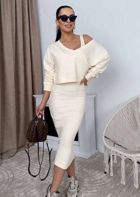 Il Completo Lucilla è perfetto per chi cerca comfort e versatilità. Il vestito aderente e la felpa con scollo a V rendono questo completo adatto ad ogni occasione. Aggiungi un tocco di stile al tuo guardaroba!